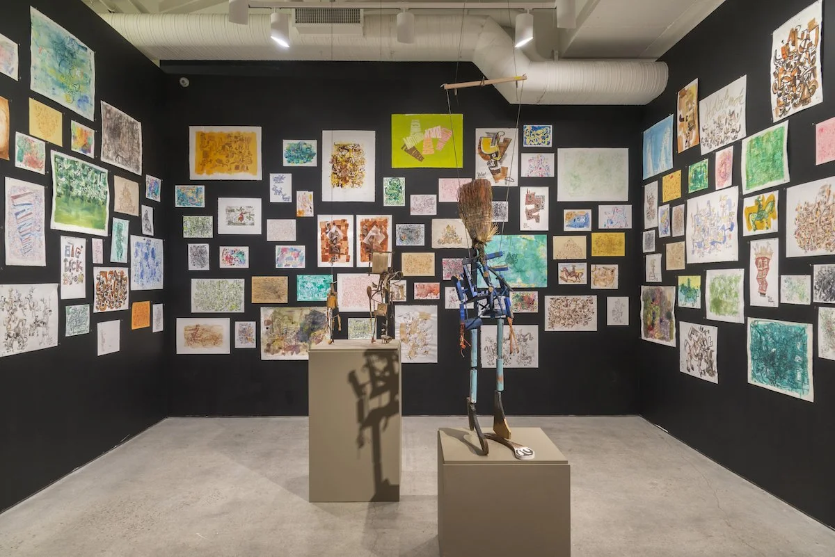 Wayne White’s third solo exhibition with Joshua Liner Gallery, on view from February 8 through March 10, 2018. The exhibition featured White’s signature “word paintings,” works on paper, puppet sculptures, and a gallery-wide installation of doodles and text from his personal notebooks. With this body of work, White shifted from his usual biting humor to a more introspective tone, exploring themes of vulnerability, reflection, and creative disassembly. Each medium, from marionettes to sketch installations, offered a glimpse into the artist’s process, building a cohesive visual narrative about the complexities of artistic expression.